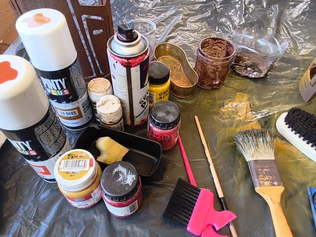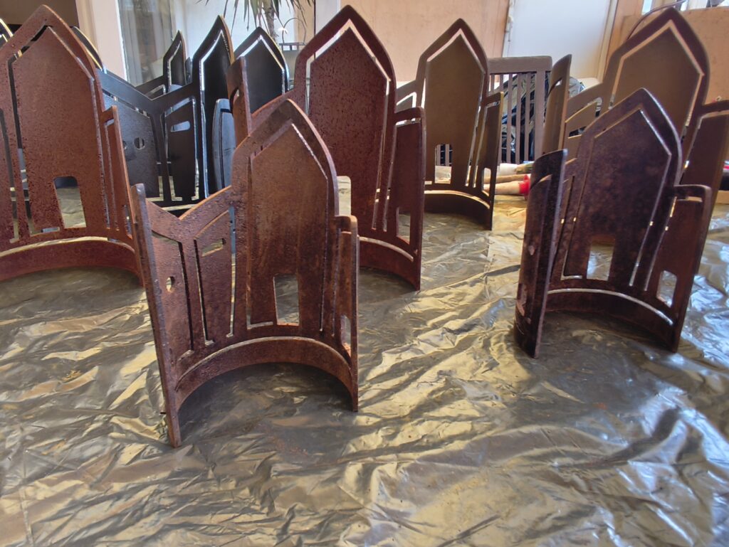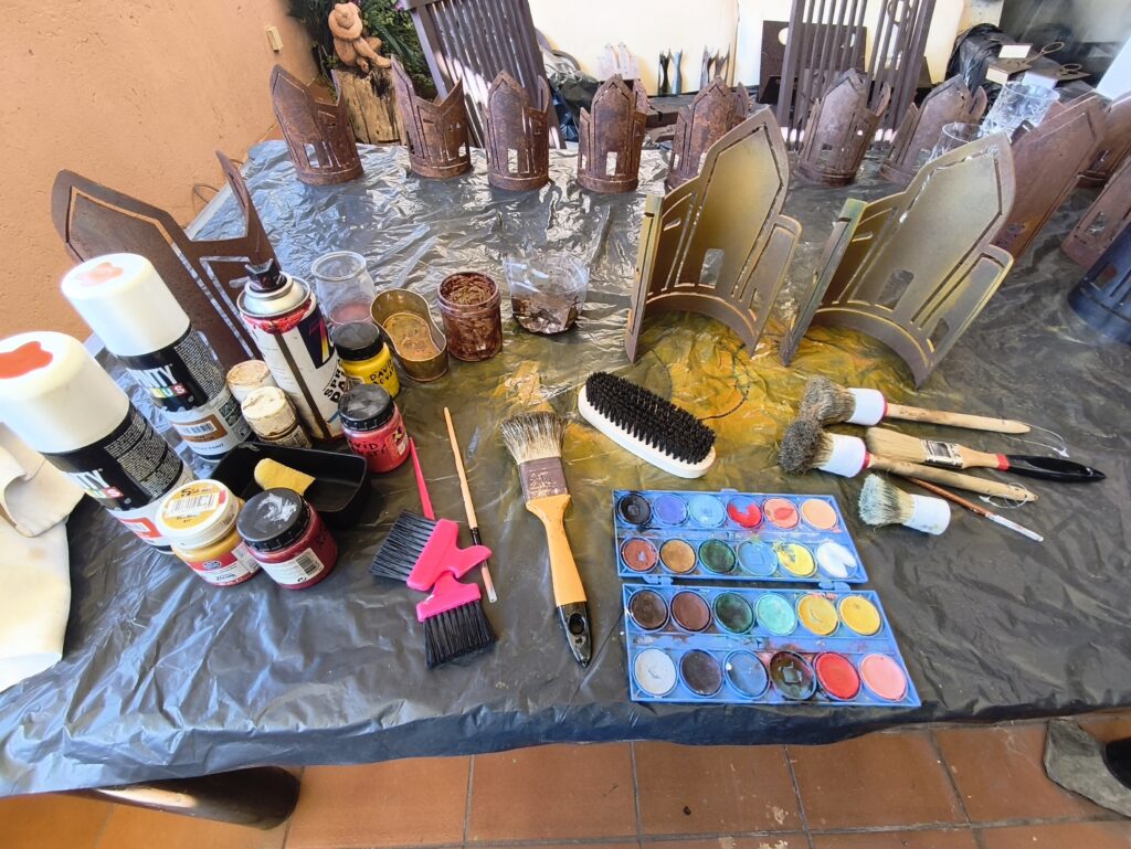 En aquests moments les peces estan en procés, no estan acabades. L’Helena està treballant les peces de ferro, tractant-les i oxidant-les amb un procés natural: amb la pluja i vent de Tramuntana del seu estimat Empordà. La pigmentació de les peces es fa a mà individualment, i el procés s’acaba amb un lacat, un vernís i ceres naturals.